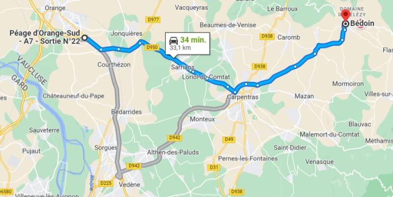 - Een enkele routeplanner wil je op de A7 laten omrijden naar de volgende afslag 23 'Péage de Vedène/Avignon Nord', volg direct na péage de rechterbaan richting Carpentras de D942 (15km); Rotonde Carpentras 2e afslag Rocade Nord, bij de eerstvolgende rotonde 2e afslag D942